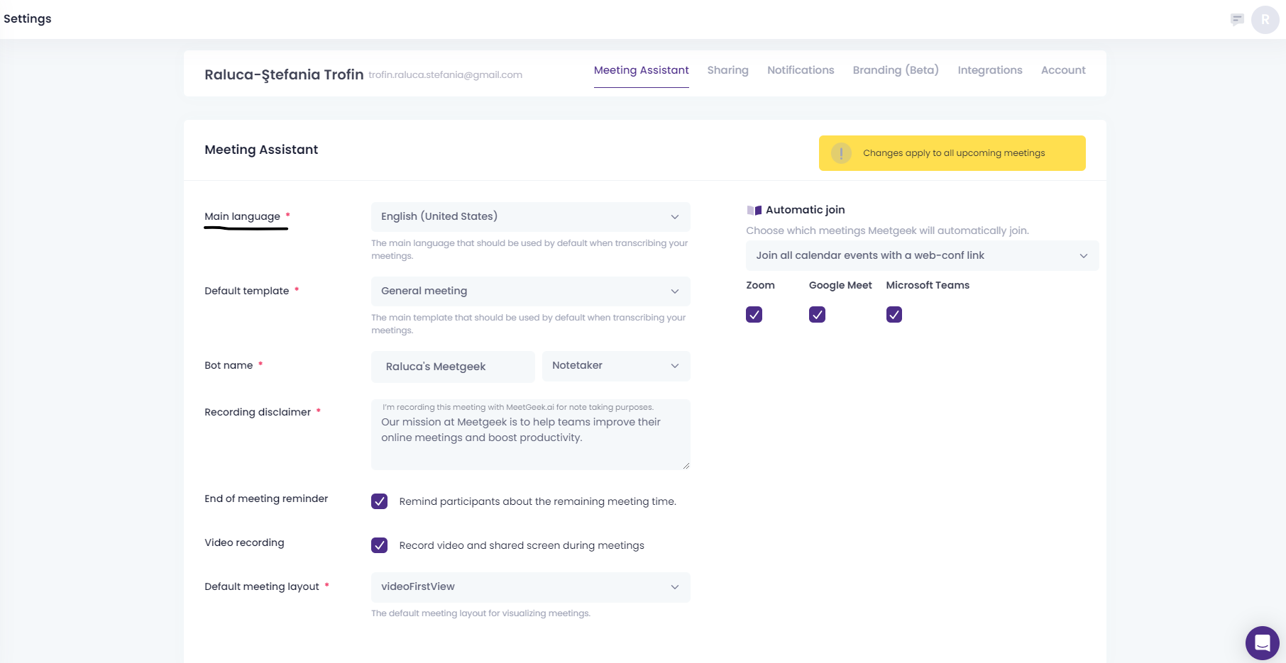 Note: Any change to the language settings will be applied to all your future meetings, overwriting any custom language settings you have previously set to a particular upcoming meeting. Past meetings that were already analyzed will not be affected. Live meetings that were started before the change will not be affected either.