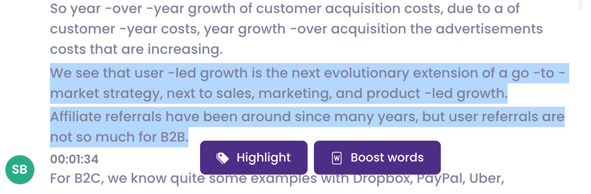 To share one particular highlight with someone, hover over that highlight in the transcription. You will then see two options: 1) create a link with the highlight or 2) immediately share it to your Slack channel, for example.