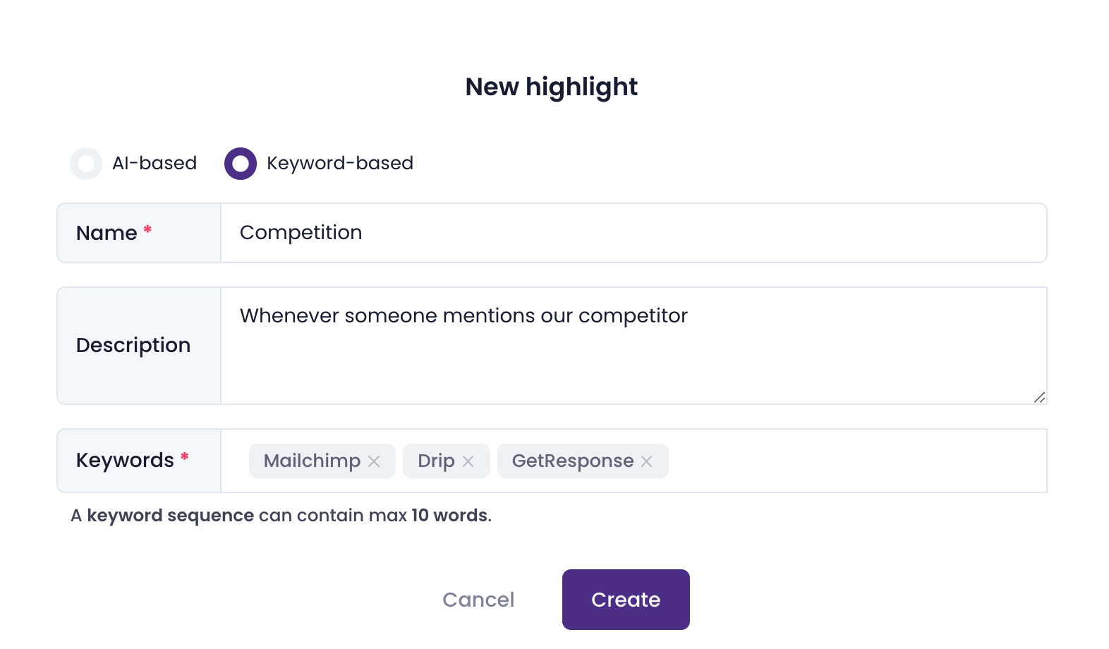 Let's imagine that you are creating an email marketing platform and want to collect feedback from users whenever they mention your competitors. Your keyword-based highlight might look something like this: