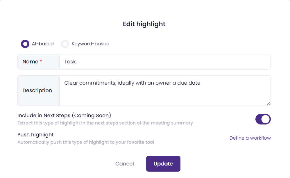 Push highlight (Optional): create a workflow that will automatically push every highlight containing a competitor name to your CRM, Slack channel, or other workspace.