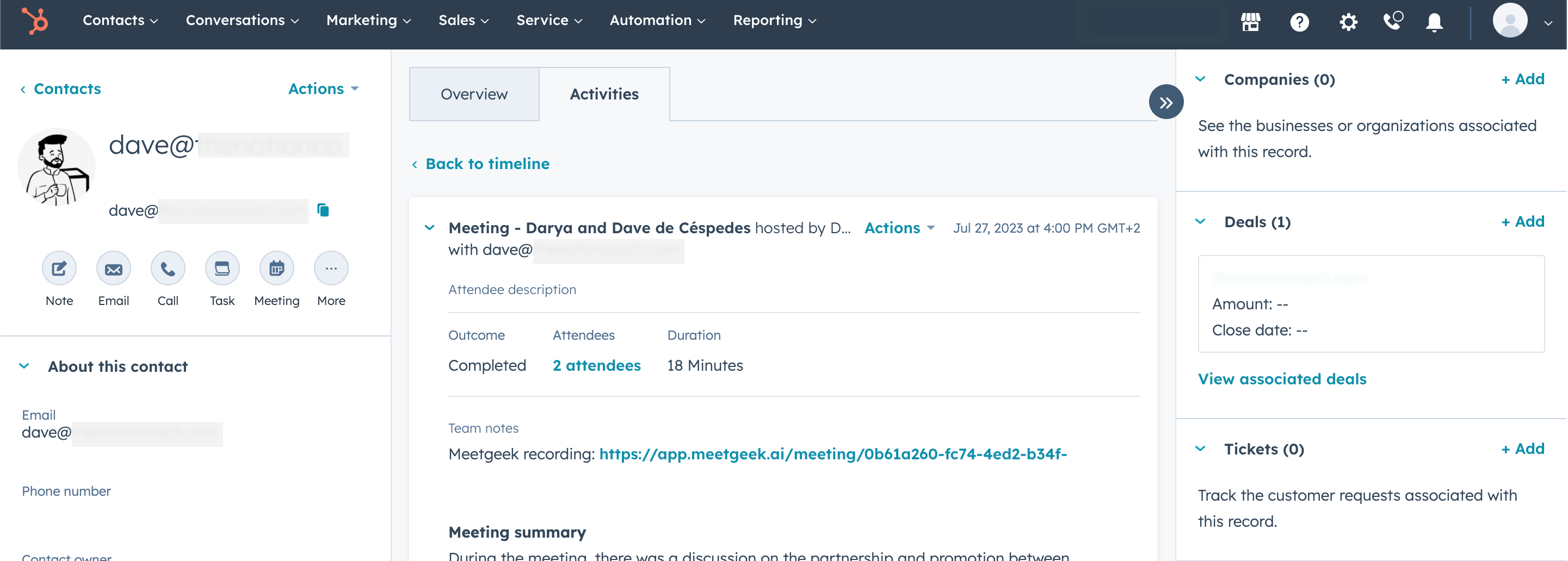 4. Once you’ve done that, the meeting summary will be immediately linked to the deal with the associated email. If no contact with this email exists in your HubSpot account, a new deal will be created along with the meeting assets.
