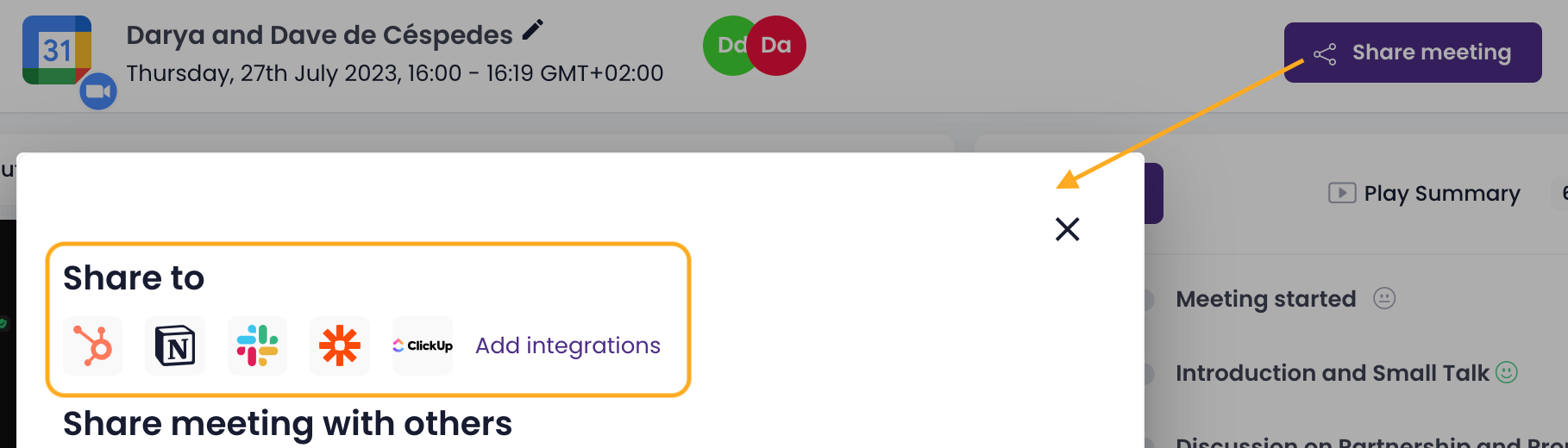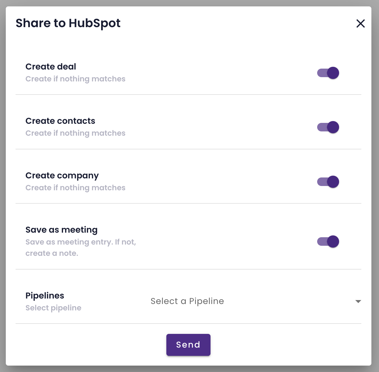 4. By selecting “Meeting” or “Highlight” in the “Given a” dropdown you can decide whether to send the whole meeting or just the highlights to your HubSpot account.