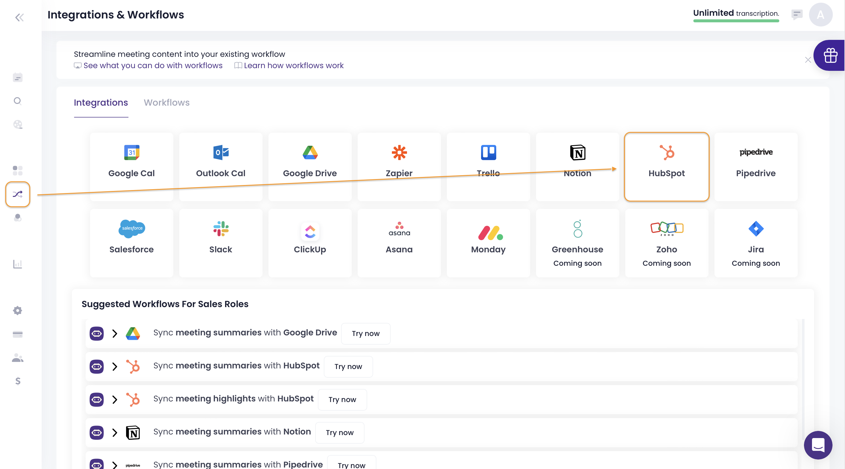 To proceed, head to the Integrations page in your MeetGeek account and enter the Workflows.