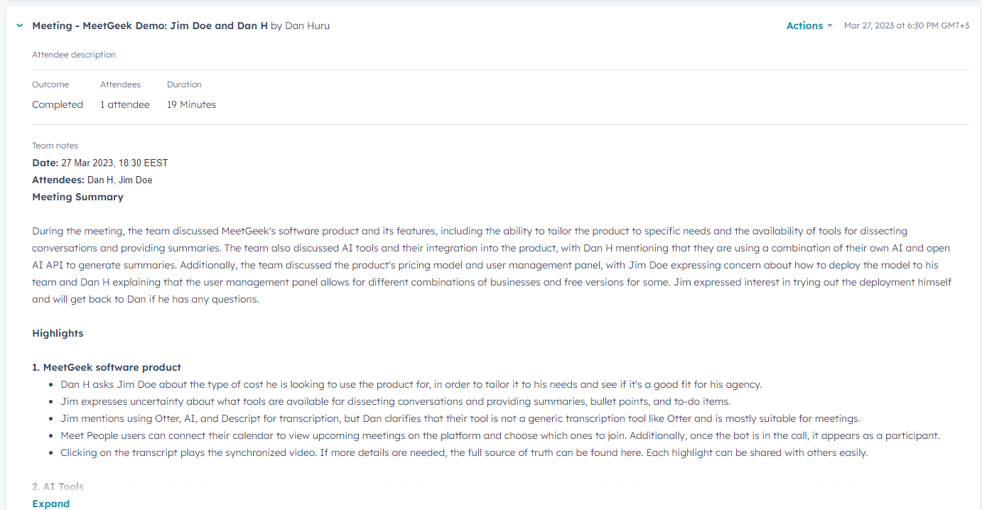 Below is an example of a deal created automatically with the associated company and contacts. The deal has a meeting entry, which captures the meeting summary and highlights.