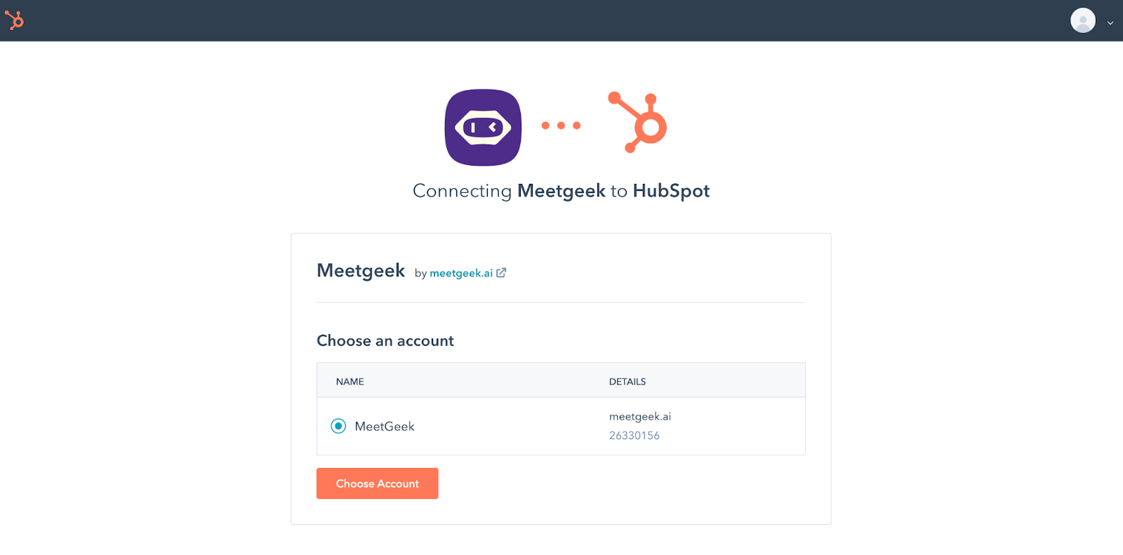Click the "Choose Account" button and MeetGeek will integrate with your HubSpot account. You will then be taken back to the MeetGeek Integrations page.