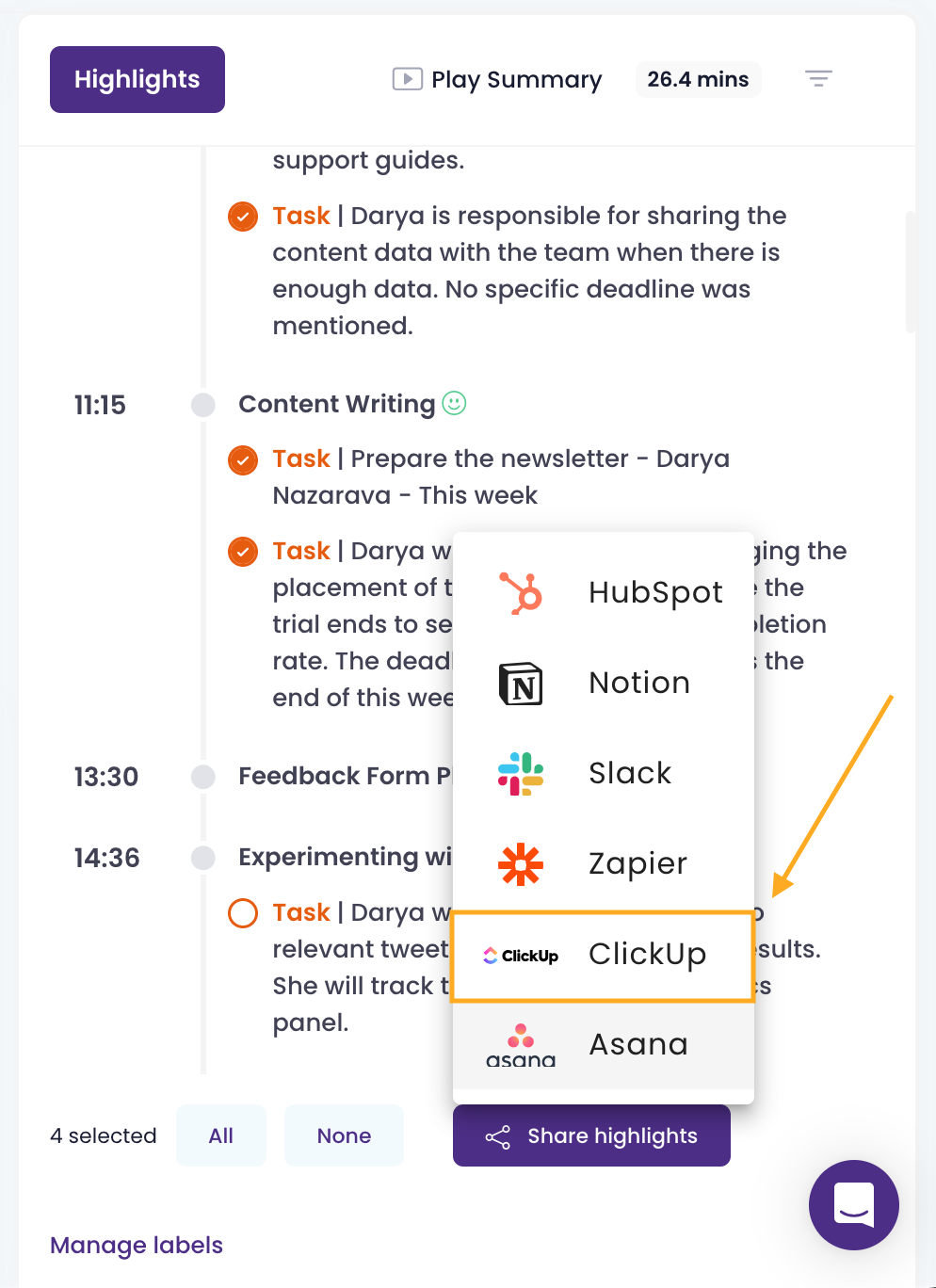 It is also possible to share only certain highlights of your meeting with ClickUp and not the entire meeting summary.