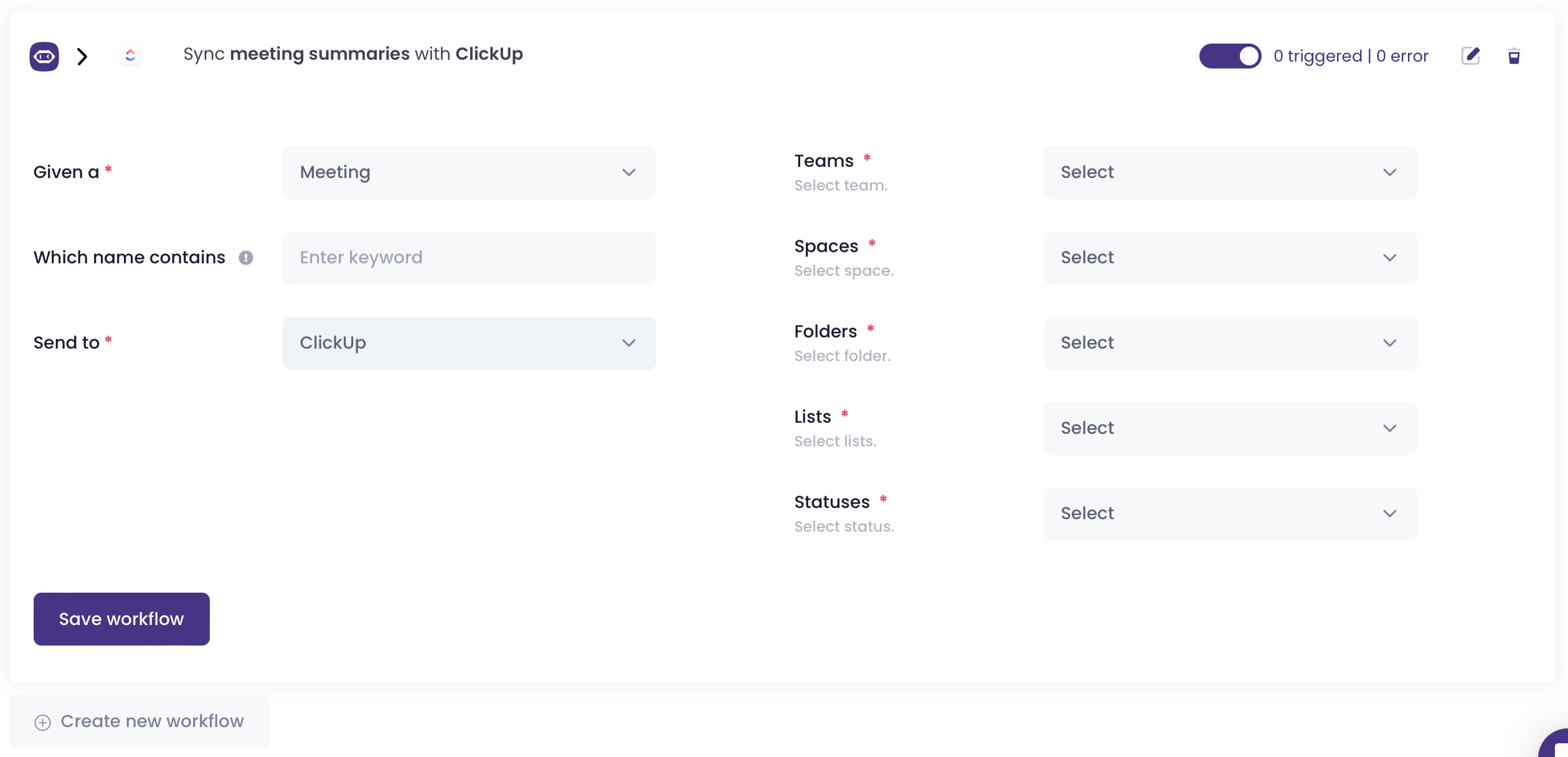 That’s it! Click the "Save Workflow" button and you’ll automatically see your next MeetGeek meeting synchronized in your ClickUp account.