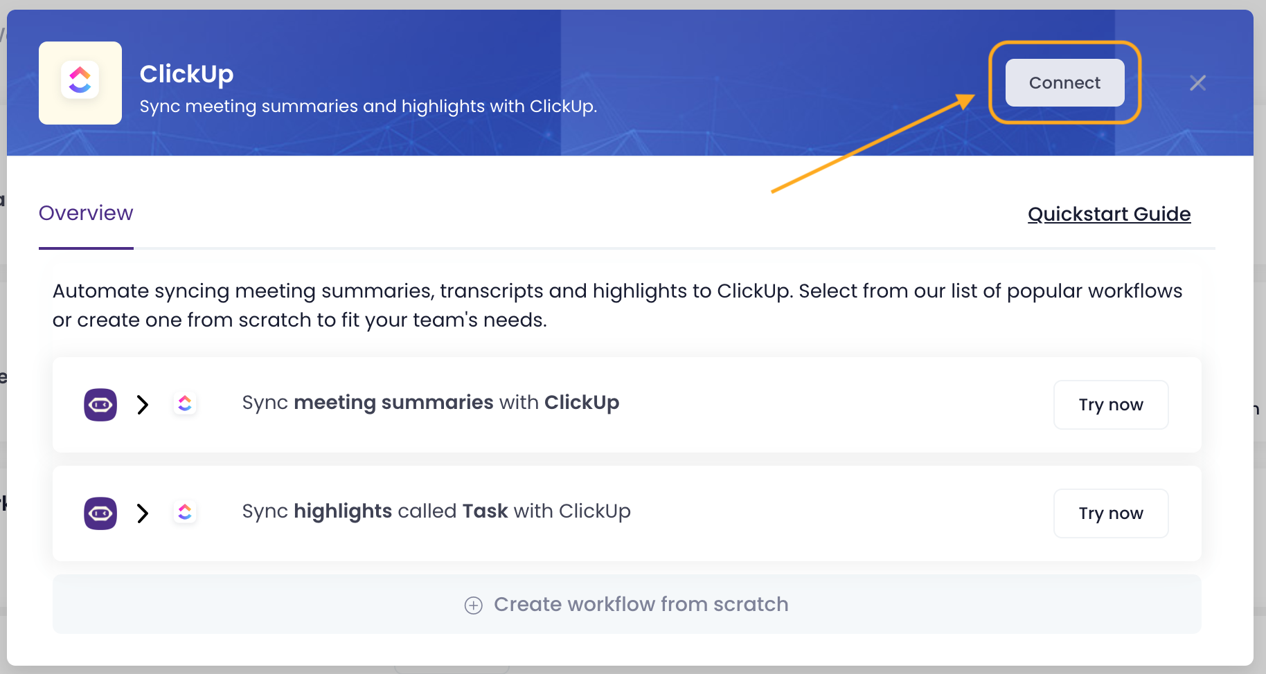 Now, let's review how to automatically connect every meeting or highlight with your ClickUp space, saving you hours of manual work each week. Let’s proceed with the creation of an automated workflow.