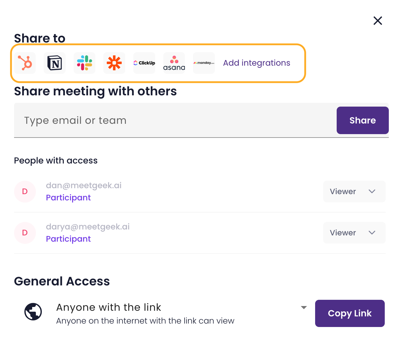 To do this, go to the meeting page of that particular meeting and navigate to the “Highlights” section. From there, select all or specific highlights and click "Share highlights".