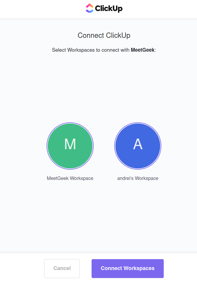 Choose the workspaces and click on the "Connect Workspaces" button and MeetGeek will integrate with your ClickUp account. You will then be taken back to the MeetGeek Integrations page.