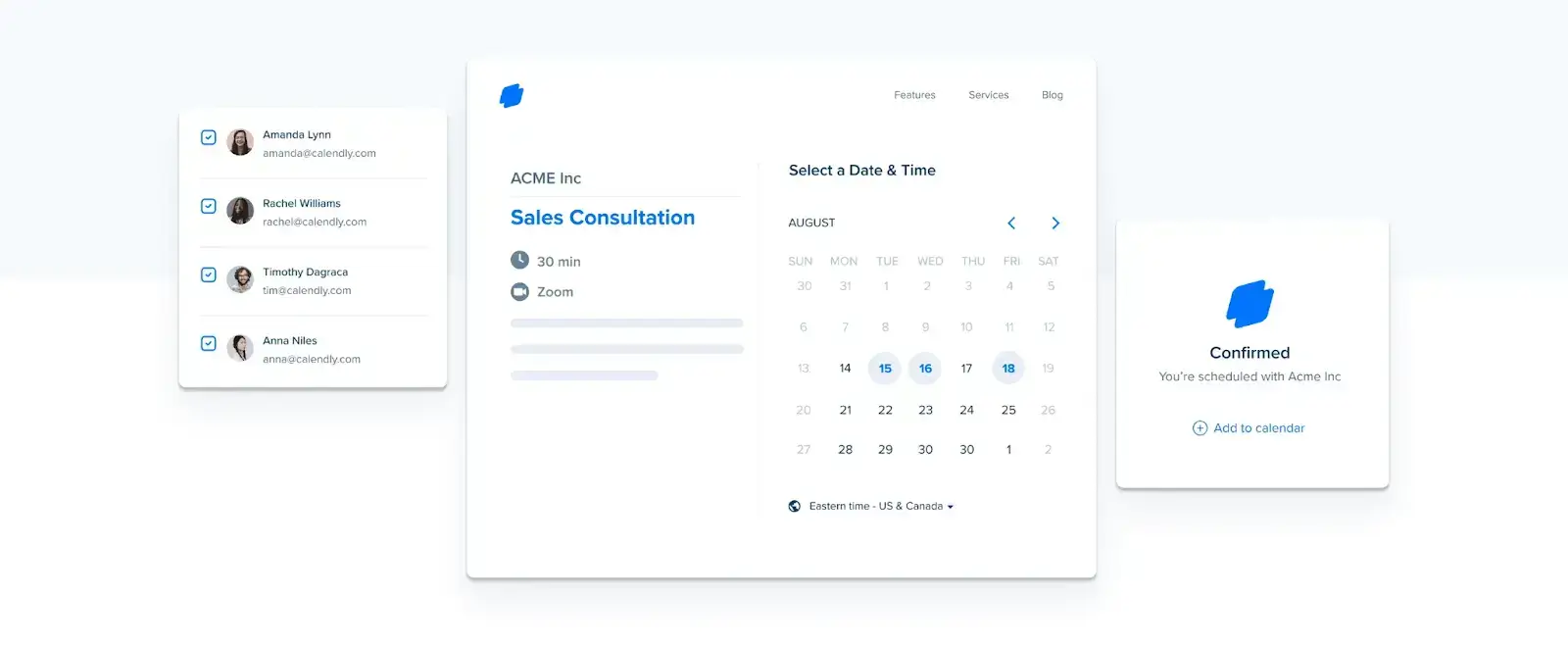 - Calendly offers team-based scheduling for routing meetings to other people on your team or including other team members in meetings.