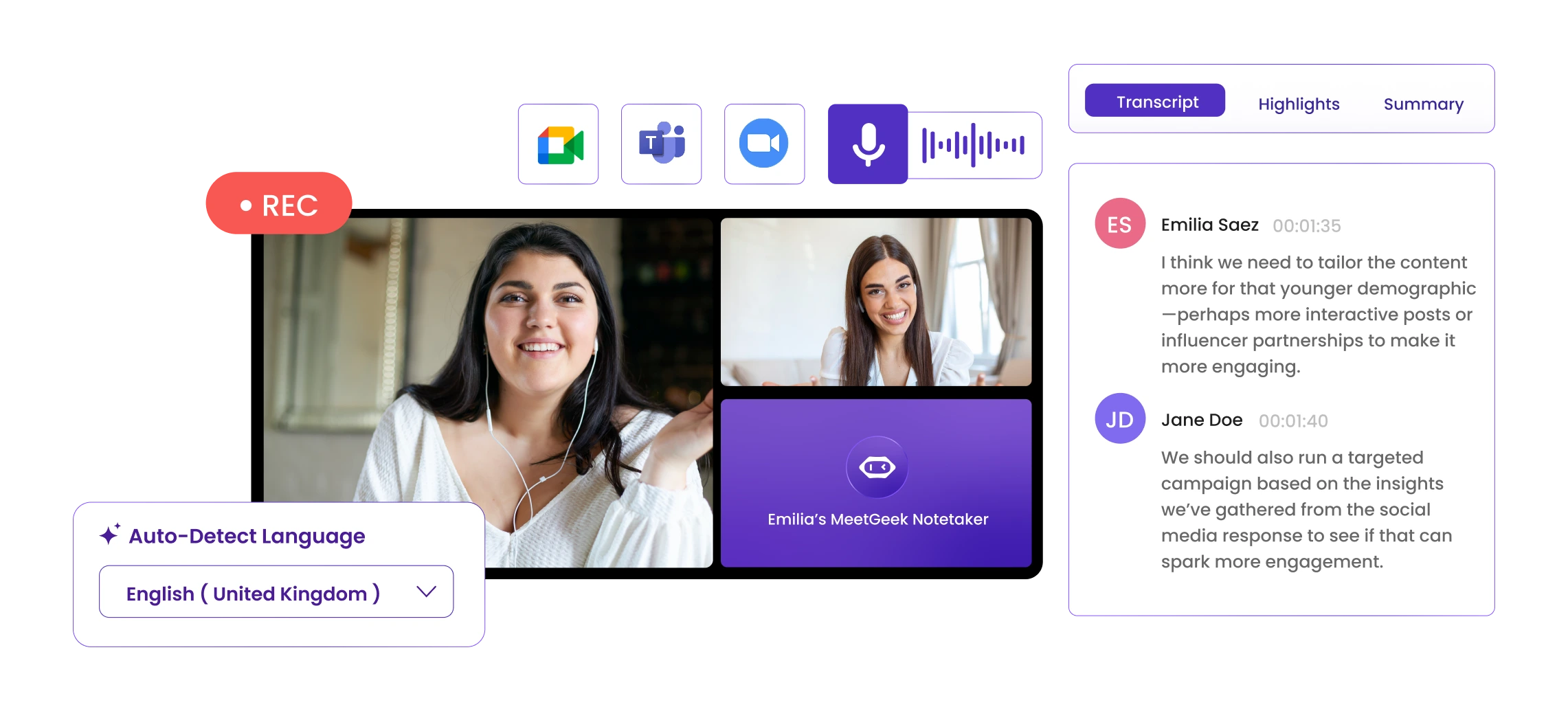 MeetGeek rejoint automatiquement vos appels sur Zoom, Microsoft Teams et Google Meet pour vous fournir un enregistrement et une transcription automatisés de la réunion, y compris: