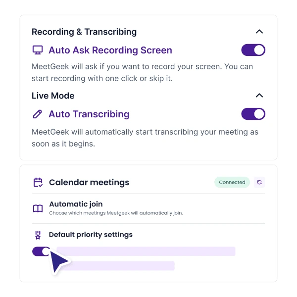 Tailor MeetGeek to match your workflow. From your Profile menu, you can control how and when MeetGeek joins meetings, records, and generates transcripts — giving you total flexibility.