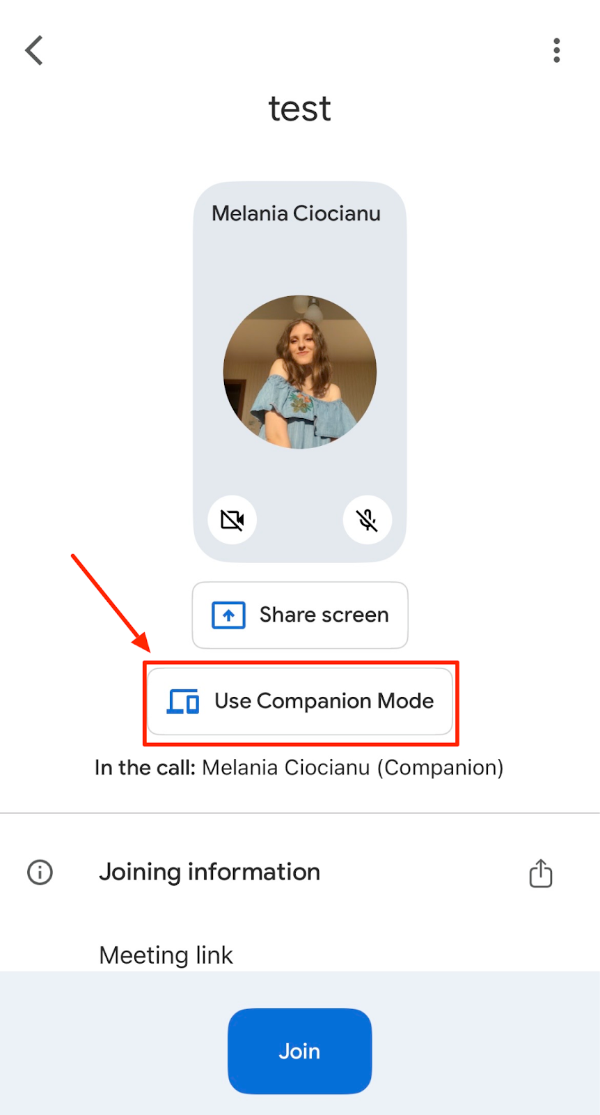 Google’s Help Center walks through Companion Mode joining from upcoming meetings and from invites, including where the “Use Companion mode” button appears under your self-view on mobile.