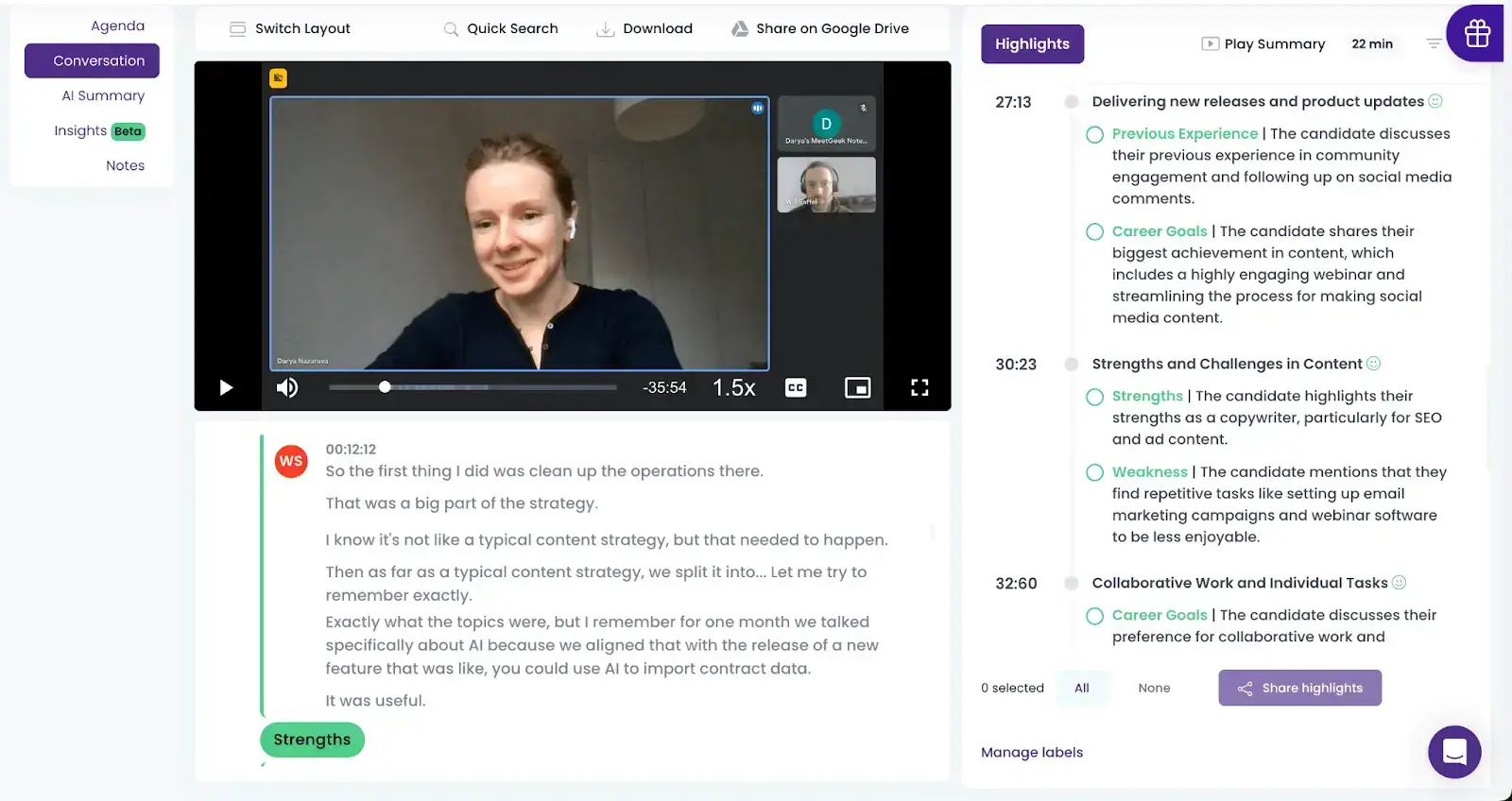 MeetGeek also provides a condensed version of your meeting's contents, enabling you to skip certain parts and focus solely on the interview process.