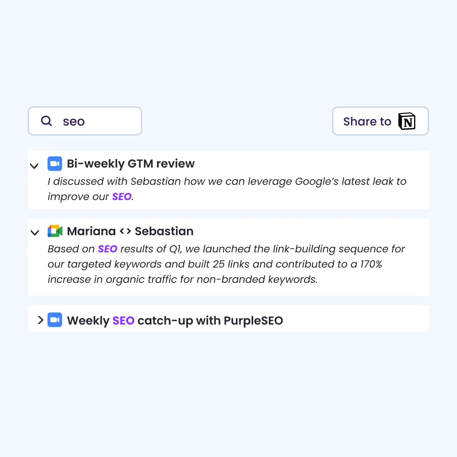 Não há necessidade de sincronizar chamadas para quem perdeu uma reunião e precisa do contexto — tudo o que você precisa está a apenas uma busca de distância.