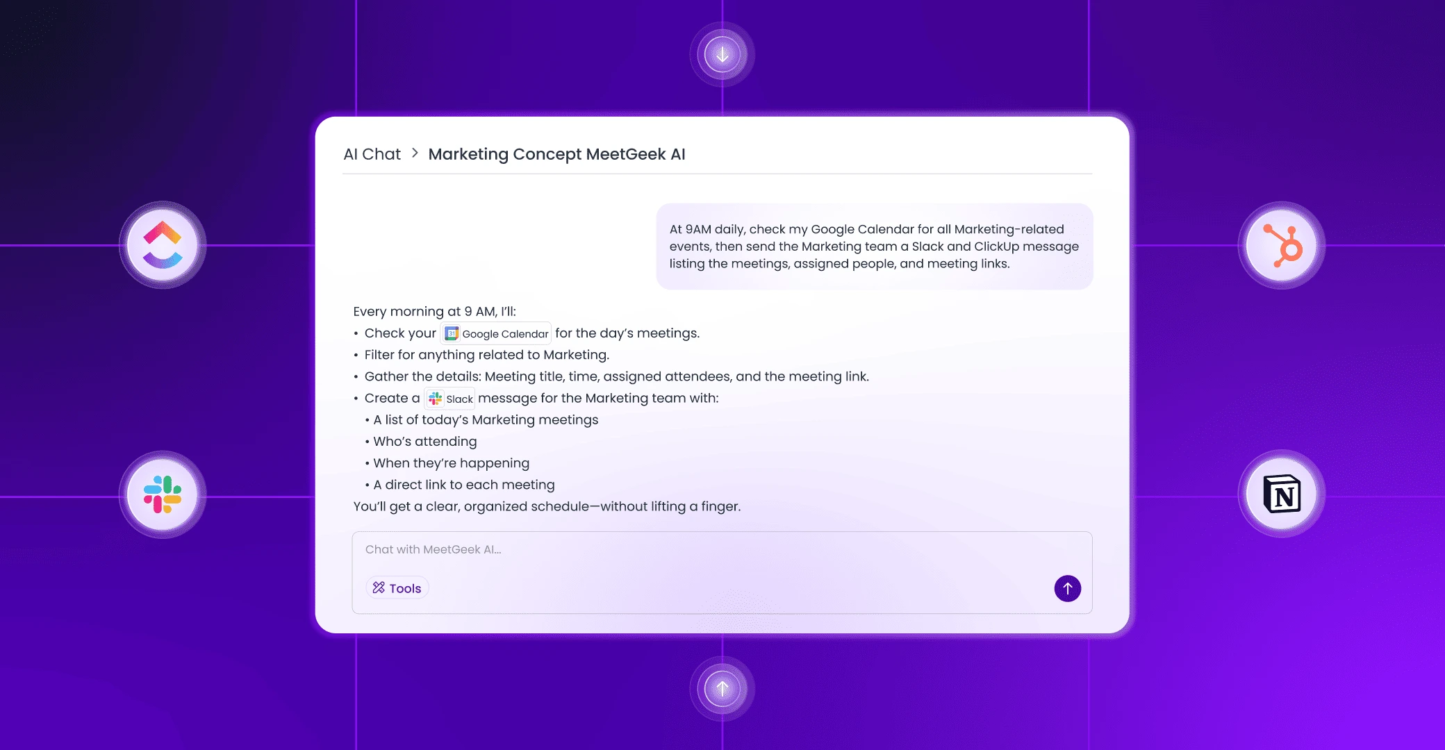 Connect MeetGeek to Slack, ClickUp, Notion, or HubSpot to automate next steps and updates.