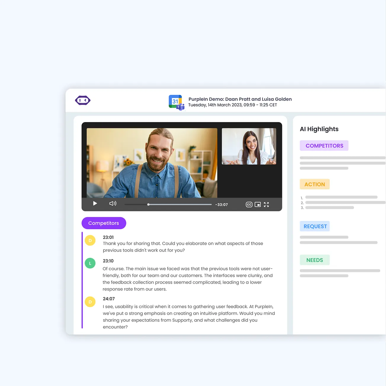 Transforma horas de entrevistas en información útil en cuestión de minutos. MeetGeek identifica los puntos débiles, los temas clave, las solicitudes de funciones y las opiniones de los usuarios. Todo ello se etiqueta automáticamente y se organiza para facilitar el descubrimiento de productos, las pruebas de usabilidad y la validación de los clientes.