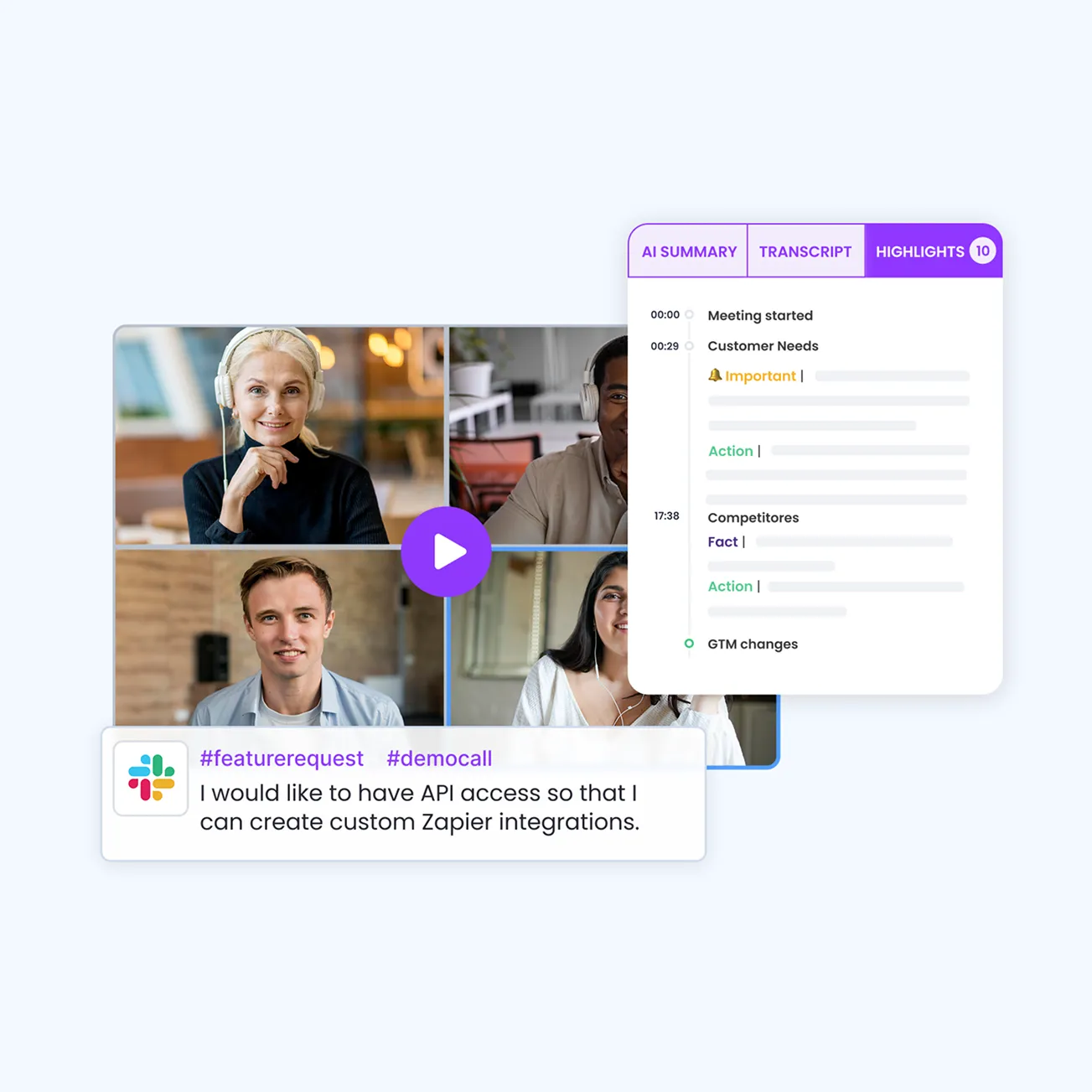 Mantén a tu equipo actualizado con alertas puntuales cada vez que se mencionen temas clave, como la competencia o las solicitudes de funciones, durante las llamadas de ventas.