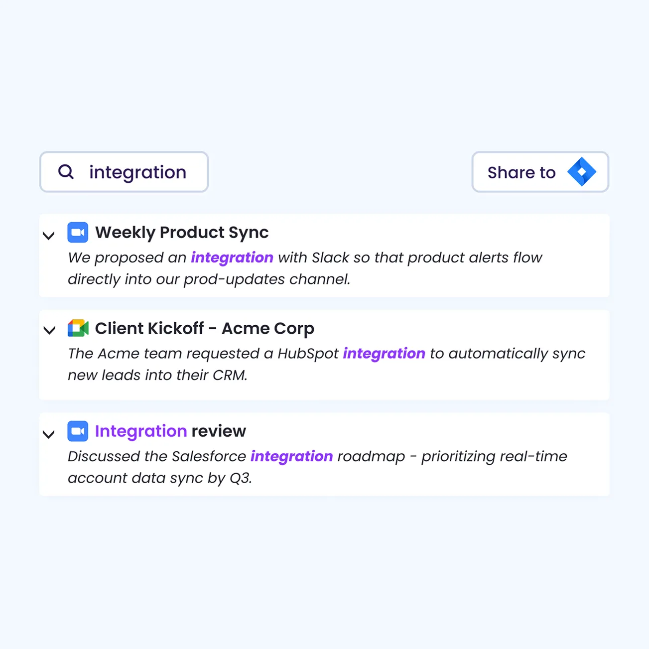 Keep using your favorite tools while MeetGeek automatically syncs meeting content and key highlights wherever your team gets work done.