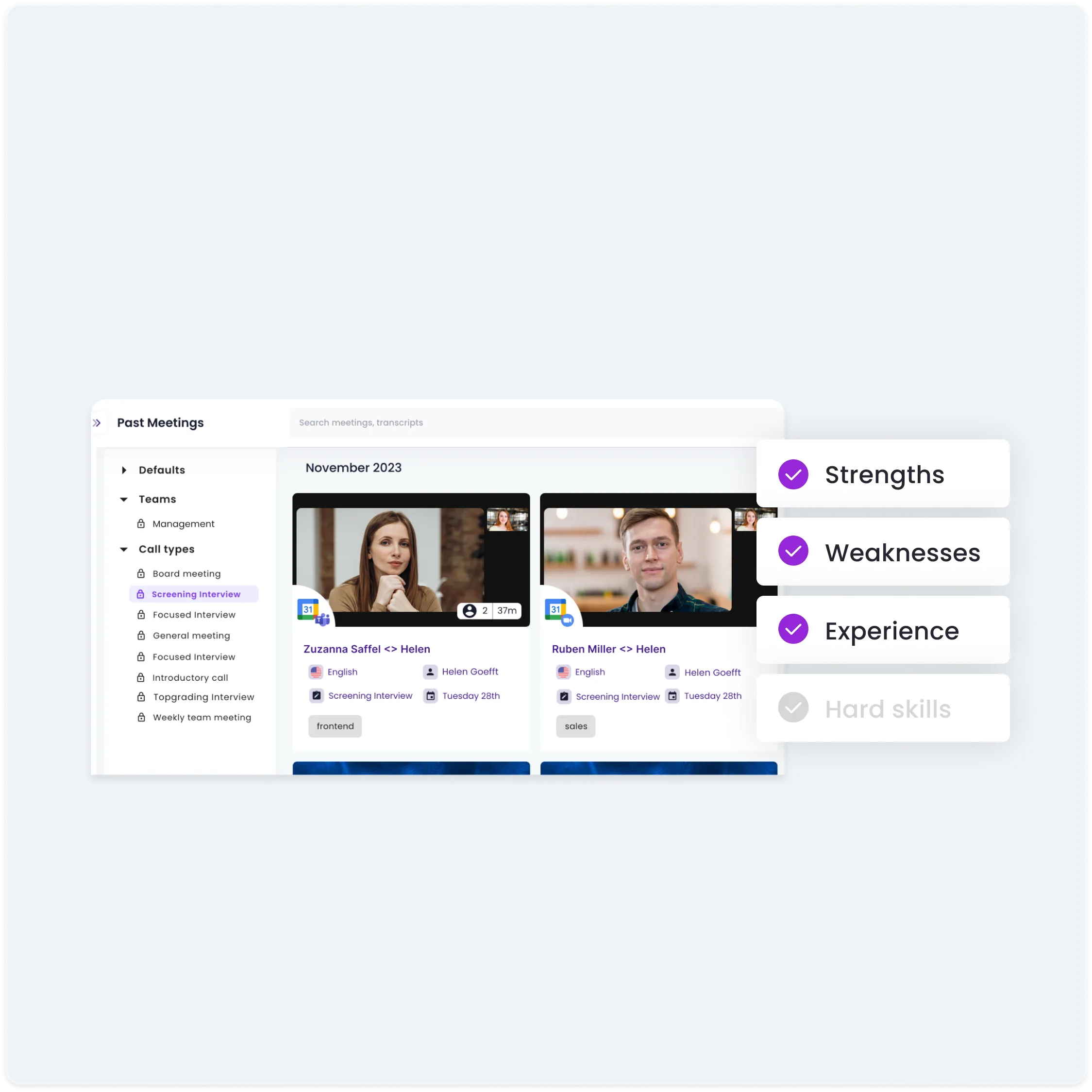 Concentre-se nas competências e dicas não verbais dos candidatos, enquanto a MeetGeek lida com as anotações. Reduza o tempo de decisão de contratação em 40% compartilhando os principais momentos com os gerentes de contratação.