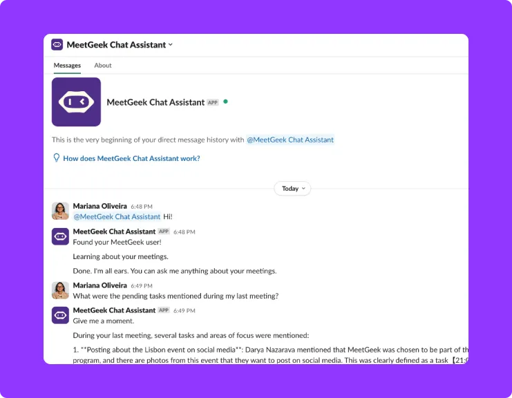 Integre um assistente de inteligência artificial ao seu espaço de trabalho do Slack que possa responder a qualquer pergunta relacionada às suas reuniões anteriores. Interaja com o MeetGeek Meeting Chat Assistant em mensagens diretas privadas ou canais de equipe para obter respostas instantâneas sobre as conversas que você organizou.