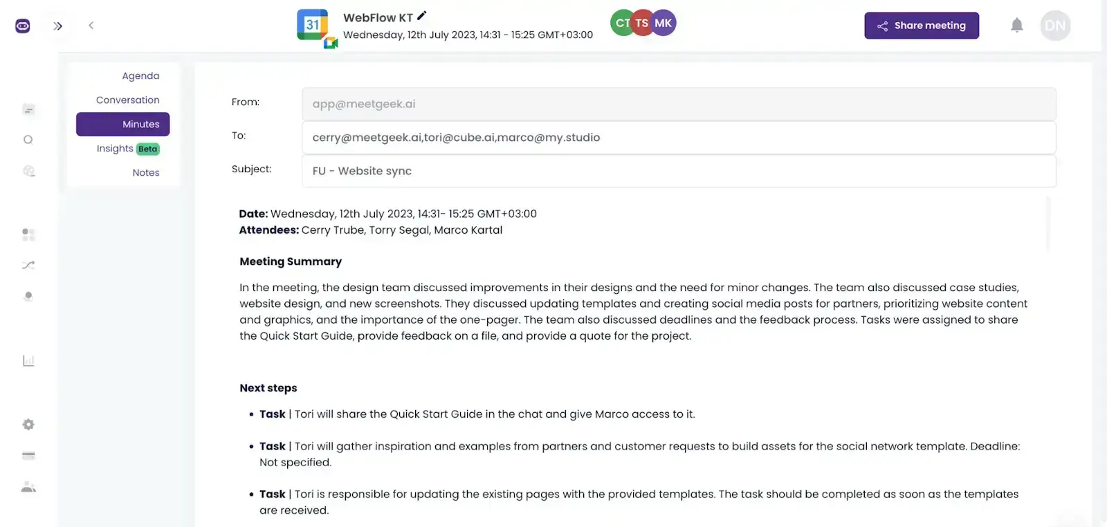 Sometimes, you’ll need to go through entire meeting recordings and extract the next steps you discussed. If you need help with this step or time is not on your side, MeetGeek can help. Basically, after each meeting that it records, it automatically defines next steps and action items.