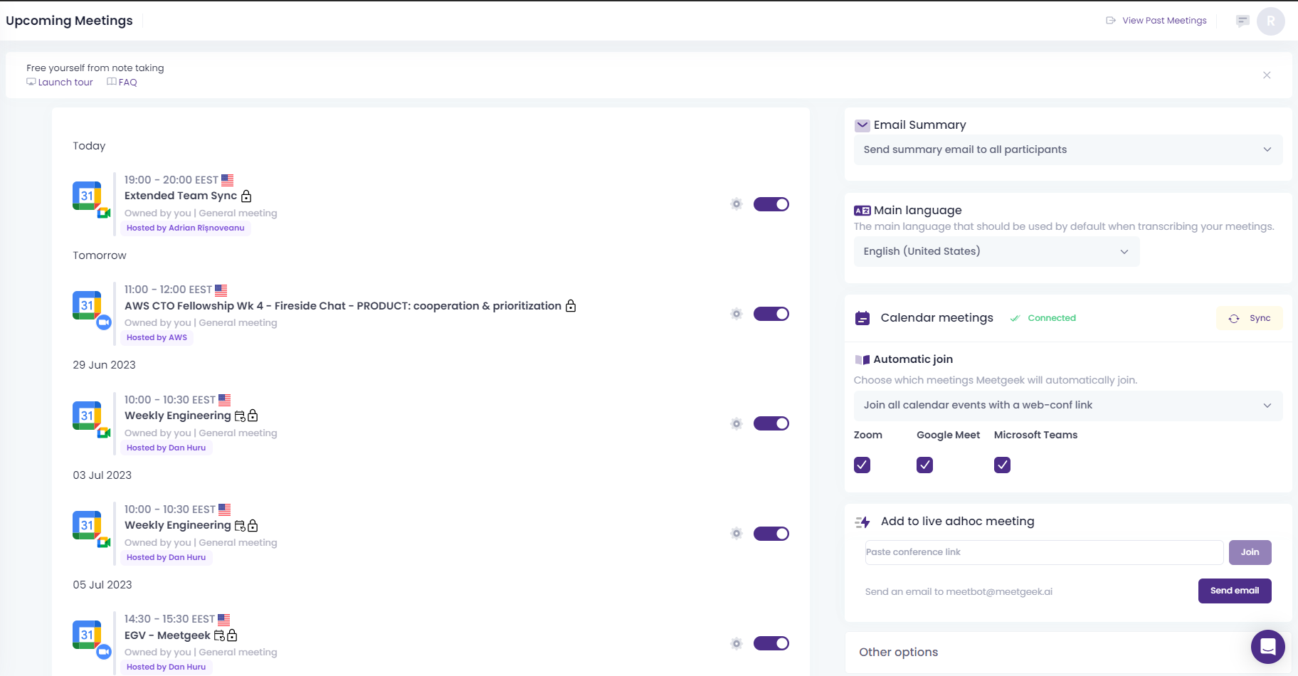 Sometimes an upcoming meeting could be held in a language different than the main language you have set in Meetgeek for your account. You can configure the same main language settings with meeting granularity from the Upcoming Meetings page. The flag near each meeting indicates the main language for that specific meeting.