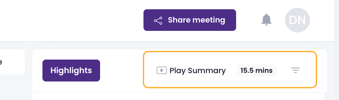 To view a summary of a meeting with MeetGeek, click on the "Play Summary" button on the meeting page. This will play the highlights of the call one after the other, skipping over unimportant parts.