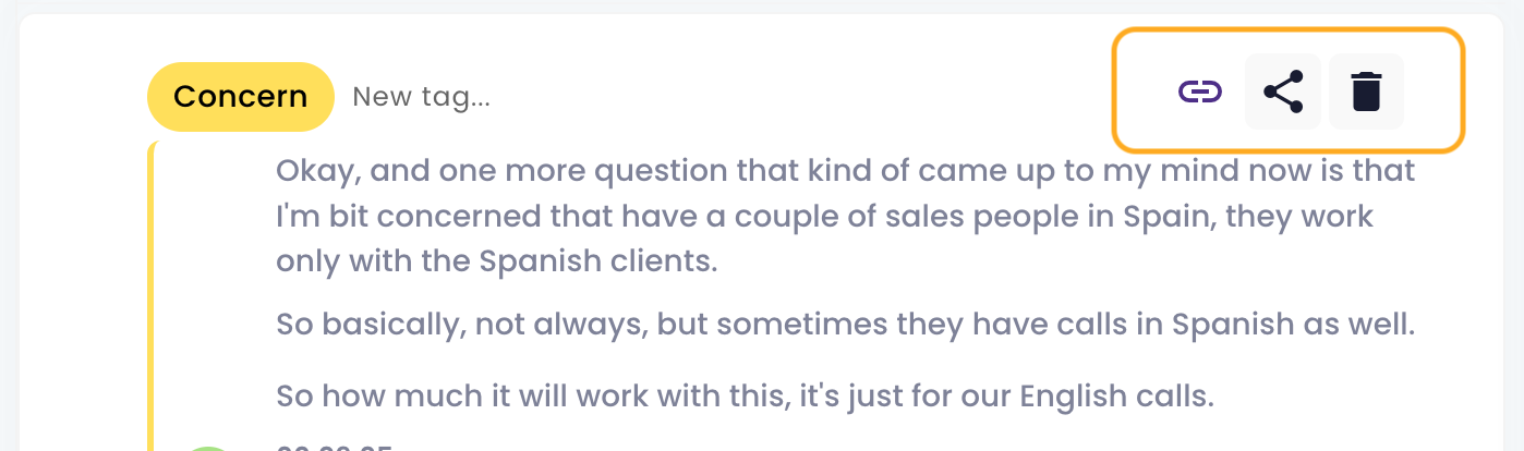 This action removes the tag from the transcript (without deleting the corresponding portion of the conversation) and deletes the highlight from the "Highlight" section on the right.