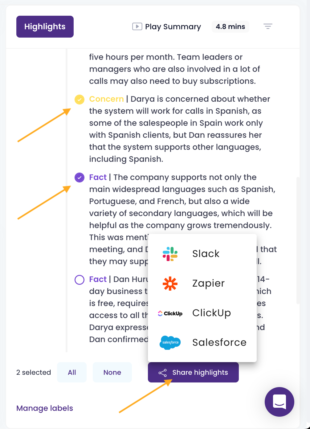 Push highlight (Optional): create a workflow that will automatically push every highlight containing a competitor name to your CRM, Slack channel, or other workspace.