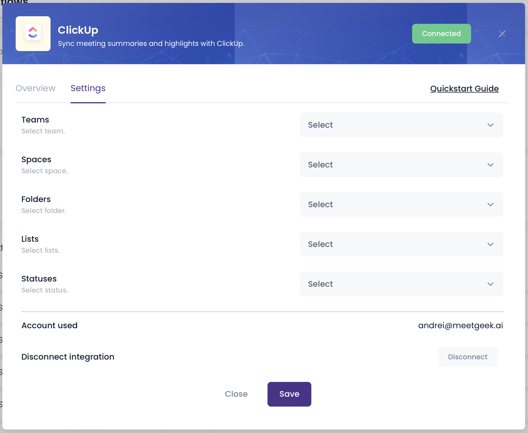 In this article, we will cover the steps to integrate MeetGeek with ClickUp, a productivity platform.