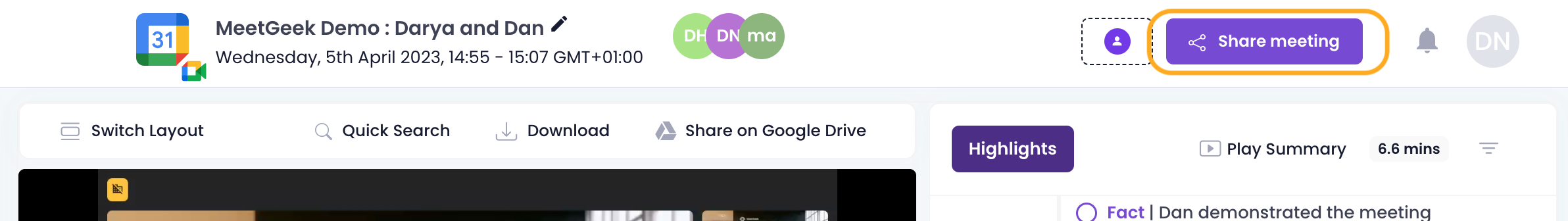 To do this, go to the meeting page of that particular meeting and navigate to the “Highlights” section. From there, select all or specific highlights and click "Share highlights".