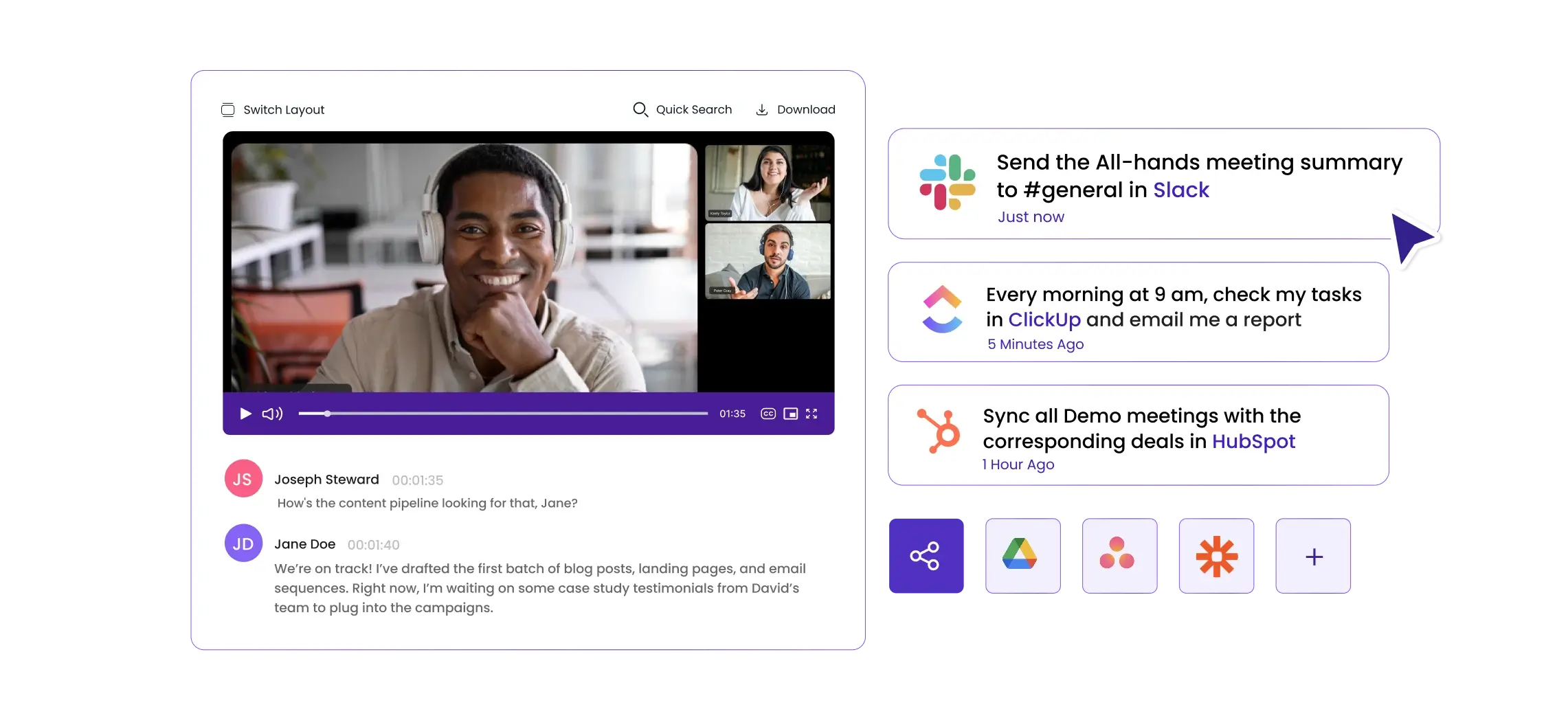 Keep using your favorite tools while Meetgeek automatically syncs your client's meeting content and key highlights with HubSpot and wherever else the team gets work done.