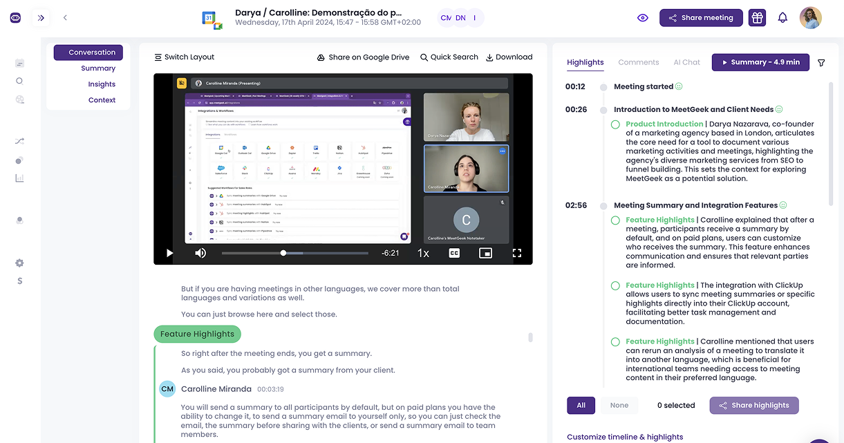 MeetGeek addresses these gaps with a more flexible setup. It can record and process conversations held online or offline through the mobile app, using the same transcription and summarization quality across contexts. Whether you’re running a Zoom presentation, a client meeting in Google Meet, or a face-to-face interview, MeetGeek keeps all your data in one searchable library.
