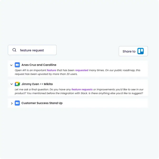 Enregistrez, transcrivez, résumez et résumez automatiquement des vidéos, et partagez des informations détaillées issues de chaque réunion vers n'importe quel outil.