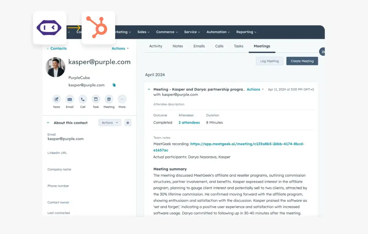 For example, connecting HubSpot with MeetGeek helps your sales team move faster, automate data entry, seamlessly collaborate on deals, improve customer relationships, and ultimately win more deals.