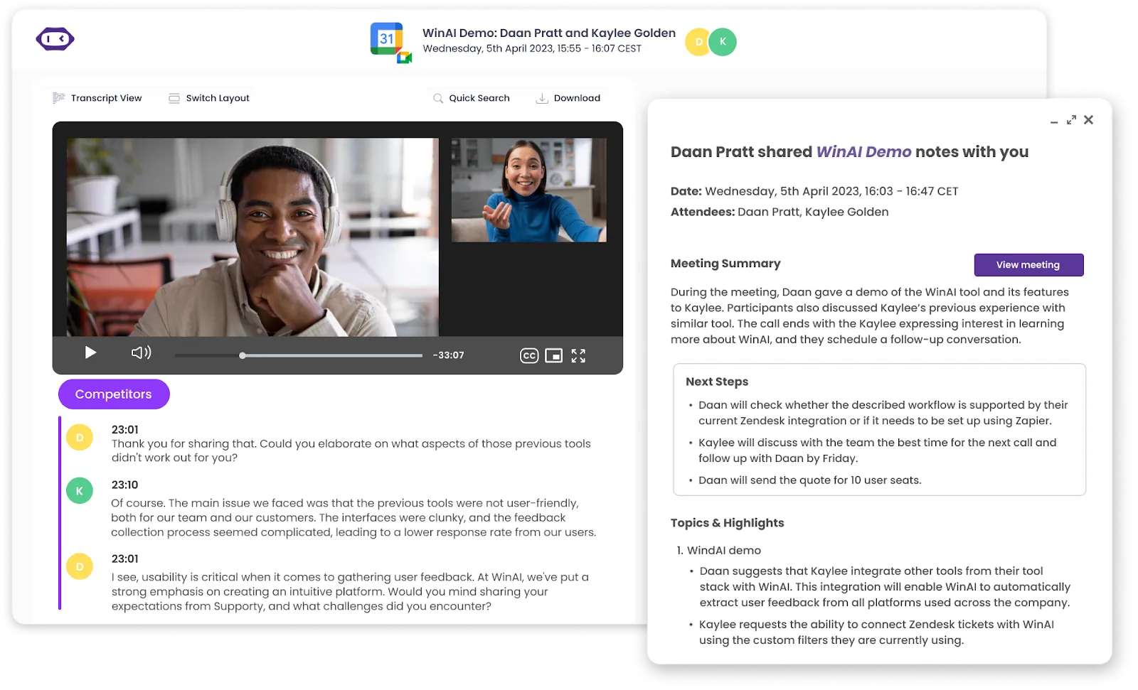 - Transcrições pesquisáveis: Localize rapidamente discussões ou tópicos específicos em suas gravações de reuniões usando transcrições pesquisáveis. Isso economiza tempo e facilita a busca de informações relevantes antes da próxima reunião.