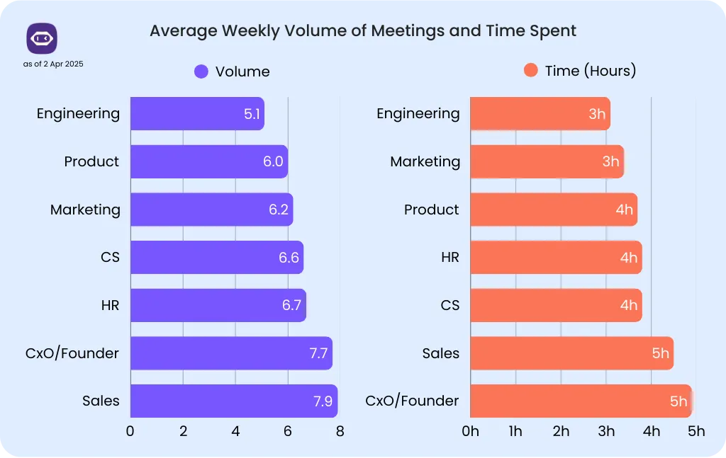 Em termos de tempo, cargos de liderança e funções voltadas para o cliente costumam passar até 5 horas por semana em reuniões. Mesmo engenheiros, que geralmente têm agendas mais enxutas, ainda acumulam mais de 3 horas. E considerando que a média de duração de uma reunião gira em torno de 40 minutos, esse tempo se acumula rapidamente.