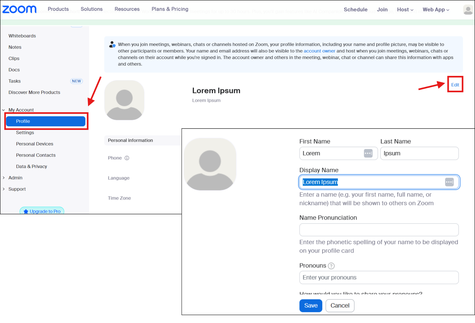 • Before a meeting (Web, Desktop, Mobile): Go to your profile → click edit → update your display name → click save.