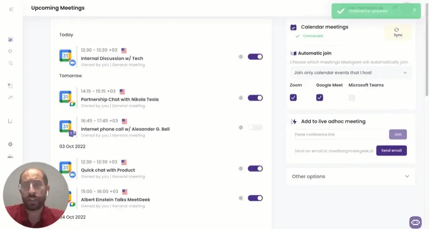 After integrating your calendar with MeetGeek, the app will display all your scheduled meetings. You can always deselect the ones you don’t need to have transcribed.