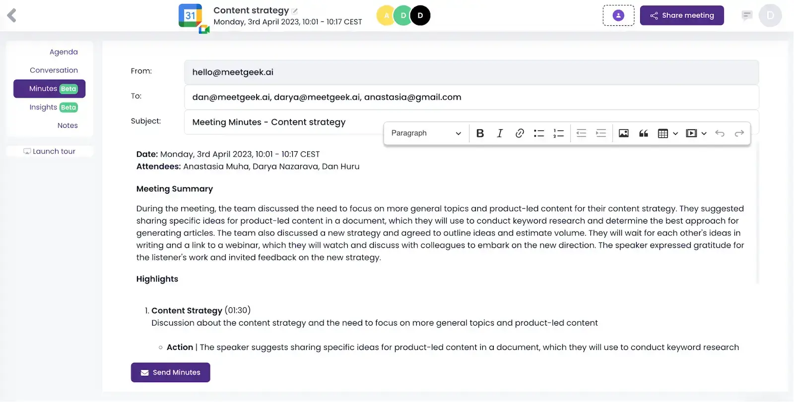 You can share the interview transcript with other team members or interested parties in only a few clicks, so you don’t have to manually transfer meeting information from a written document to your preferred email platform.