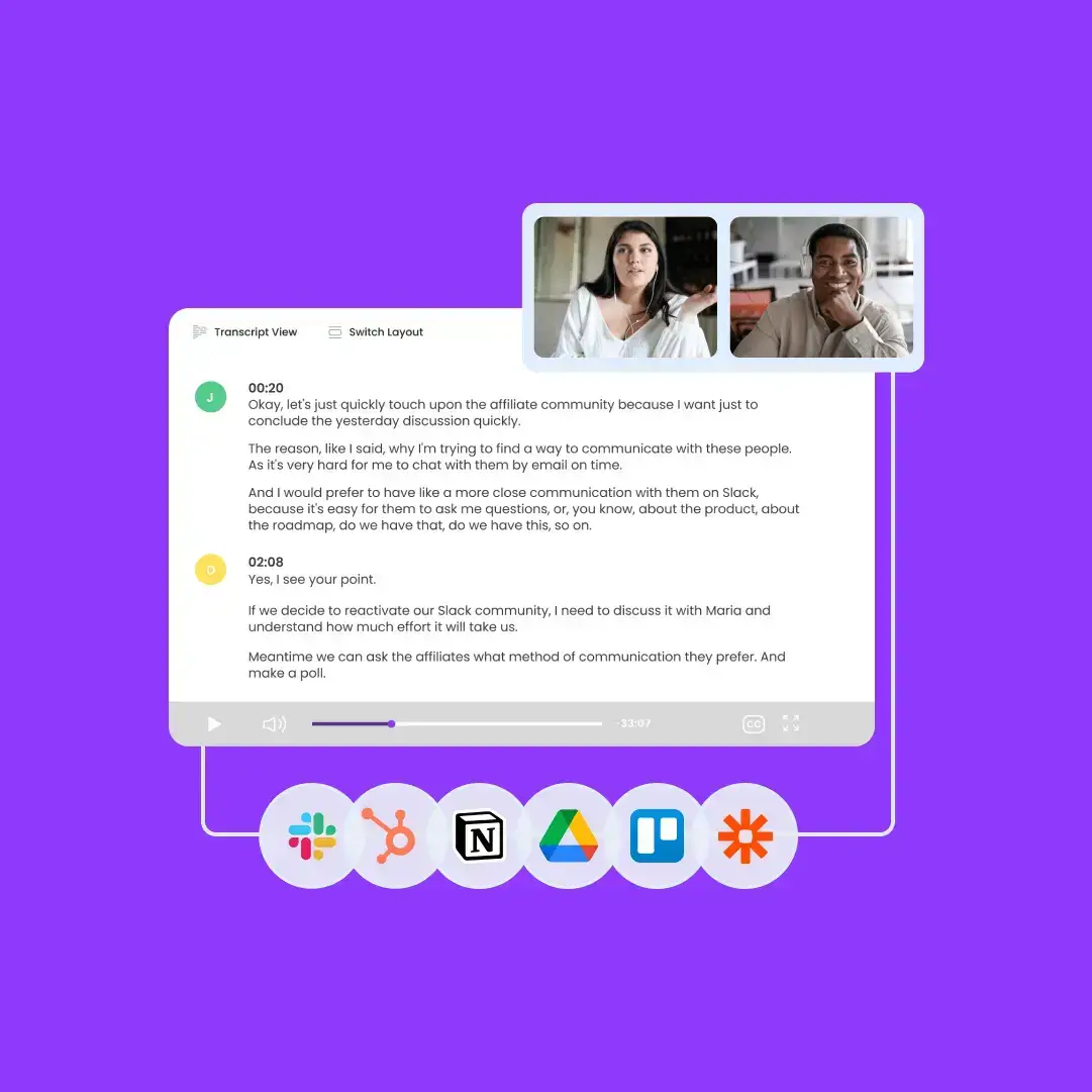 Keep using your favorite tools while Meetgeek automatically syncs your client's meeting content and key highlights with HubSpot and wherever else the team gets work done.