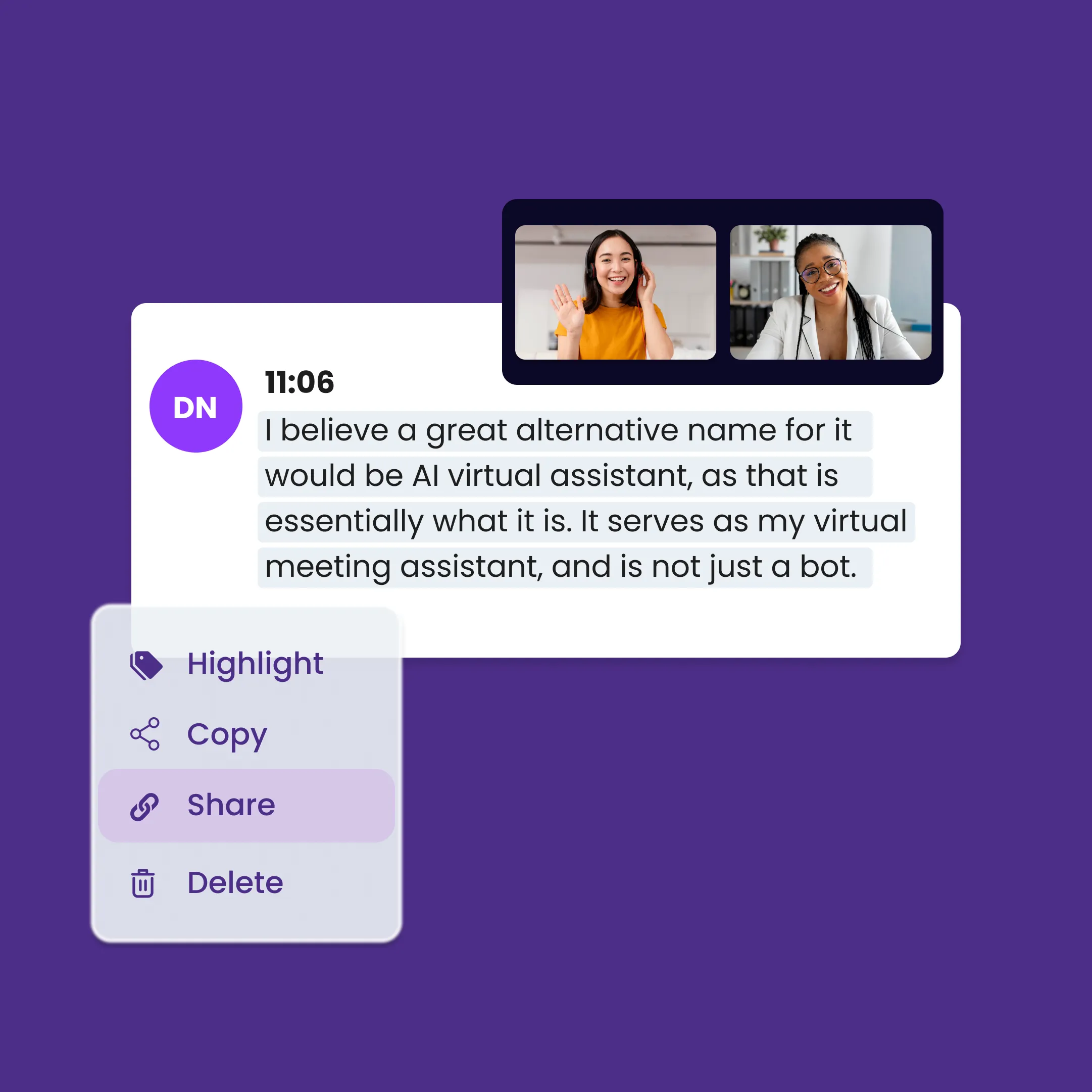 Grave vídeos, transcreva e colabore em suas reuniões do Zoom, Google Meet e Microsoft Teams.