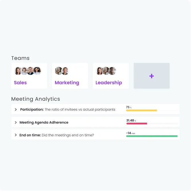 Capacite sua equipe a compartilhar dicas de reuniões e mantenha-se sincronizada com uma biblioteca segura, unificada e pesquisável de reuniões anteriores, organizada por tipos de reunião, equipes e tags personalizadas. Crie equipes e troque conhecimento automaticamente sem adicionar reuniões extras ao seu calendário.