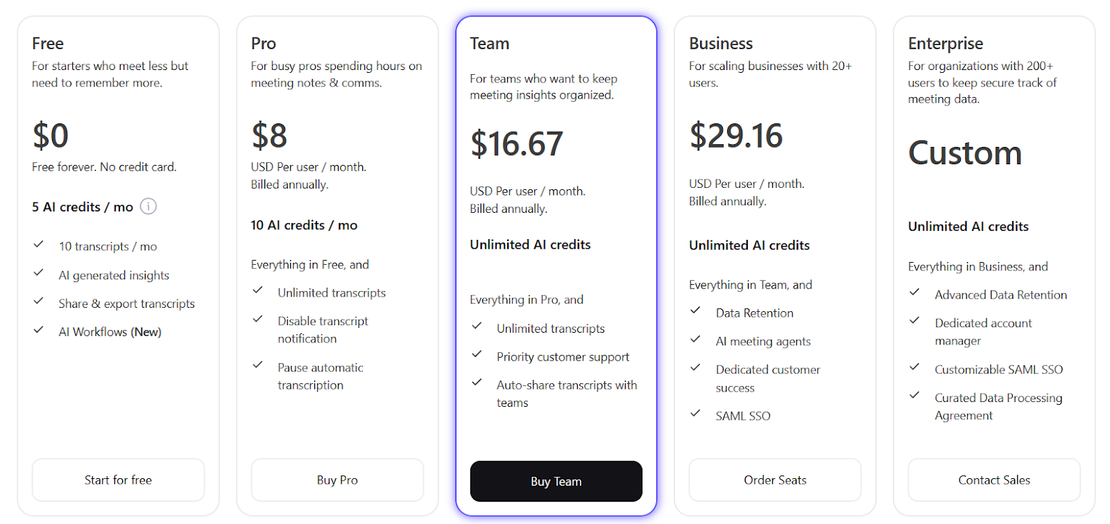 • Includes: Unlimited transcripts and unlimited AI credits, plus priority customer support, auto share transcripts, and centralized billing for the same email domain.