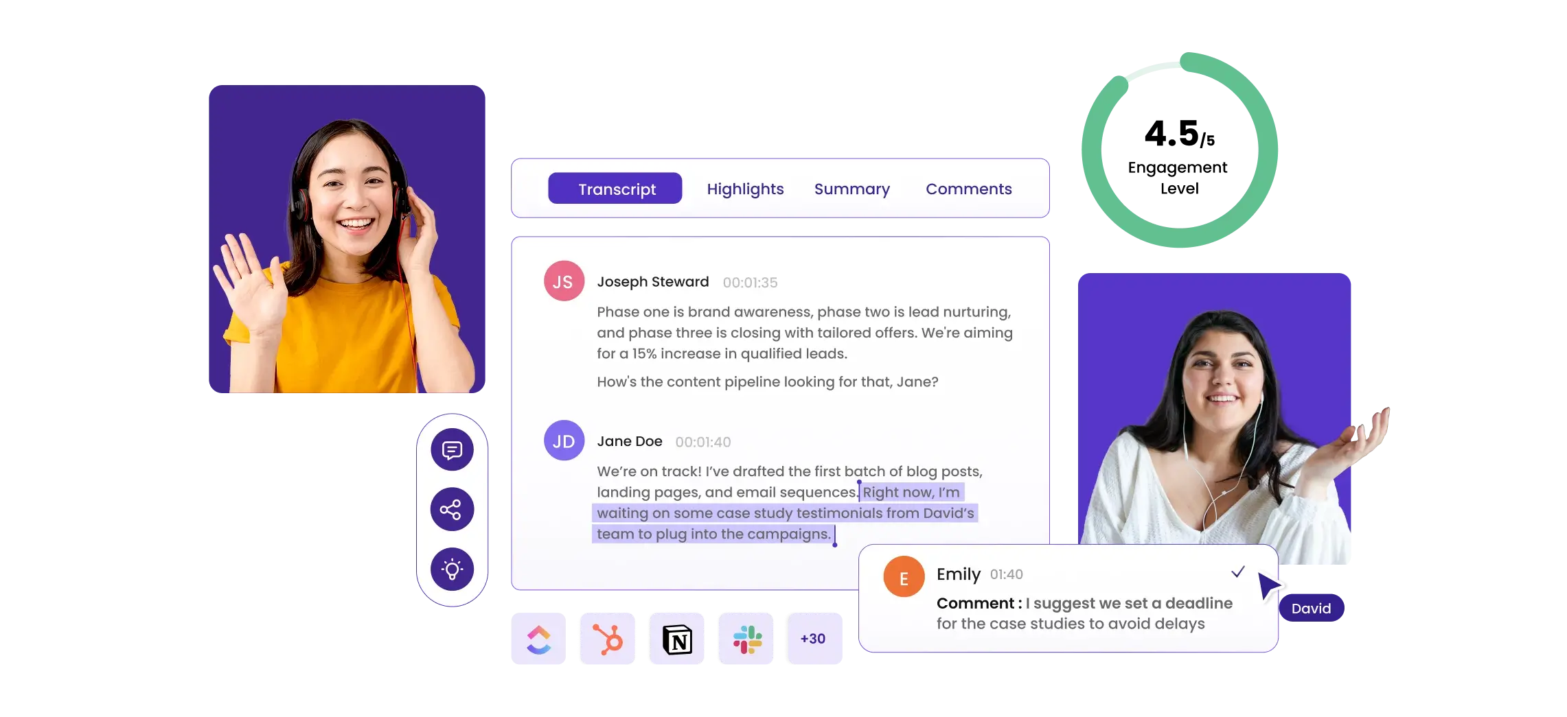 Keep using your favorite tools while Meetgeek automatically syncs your client's meeting content and key highlights with HubSpot and wherever else the team gets work done.