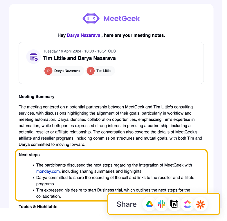 Pro Tip: MeetGeek automatically generates summaries and transcripts, which can be shared instantly with participants to keep everyone aligned.