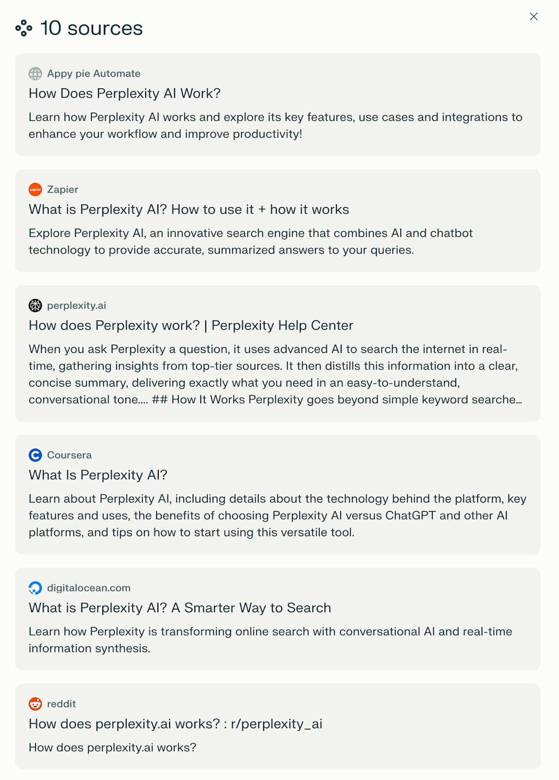 Perplexity lists exactly where it found each piece of information. This approach builds trust and allows users to verify accuracy easily, as well as dig deeper if they wish.