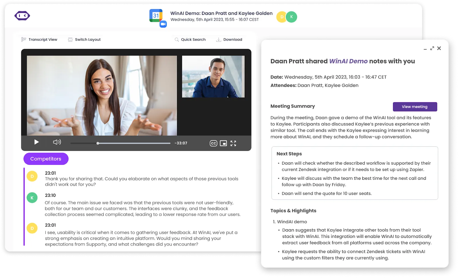 - Painel de próximas etapas: As próximas etapas sugeridas com base na reunião são exibidas abaixo da gravação, garantindo que todas as tarefas de acompanhamento sejam claras e acionáveis.